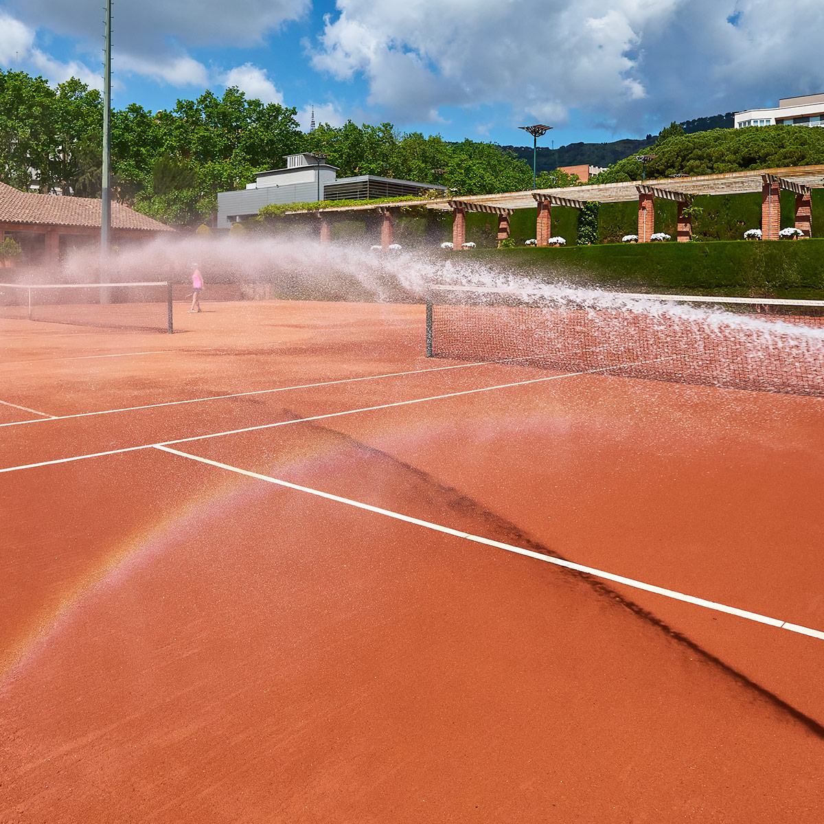 Solució de reg per polsador per a pistes de tennis que humiteja la superfície de manera ràpida i homogènia, amb temps i cabal preajustats per evitar embassaments i estalviar aigua. Compatible amb terra batuda i resines, fàcil d’instal·lar i mantenir, amb polsador protegit i reg perimetral per aspersors. Demaneu informació.